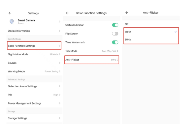 Please note: This setting only applies to battery camera. The plug in camera does not have this feature. If the image is flickering, you can change the angle of the plug in camera.