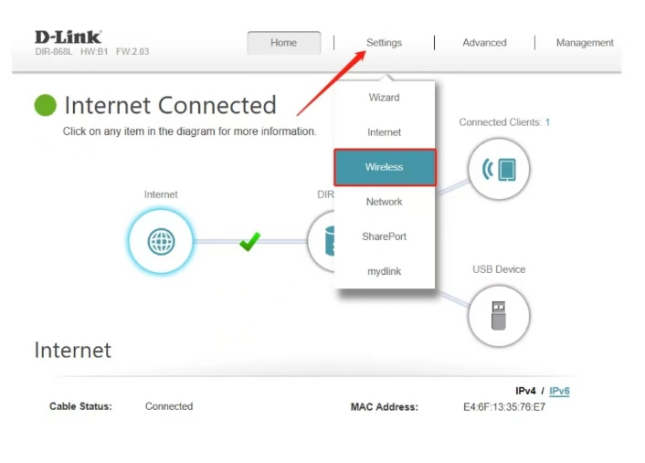 1. On the D-Link home page, click the Settings tab and select Wireless.