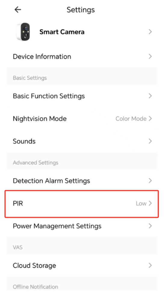 How to set PIR motion sensitivity? support March 19, 2026 02:56 Updated Home-->Settings-->PIR (Low: 3M; Medium: 5M; High: 8M) Related articles How to access the Cloud Storage? Comments 0 comments Please sign in to leave a comment.